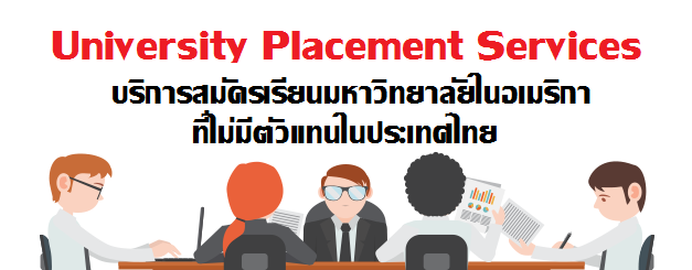 เปิดขึ้นมาเพื่อให้ความช่วยเหลือนักเรียนที่ต้องการไปศึกษาต่อมหาวิทยาลัยหรือสถาบันศึกษาที่ไม่มีตัวแทนในประเทศไทย รวมถึงมหาวิทยาลัยชื่อดังในประเทศสหรัฐอเมริกาหรือประเทศแคนาดา ยกตัวอย่างเช่น Harvard University, MIT, New York University, Boston University, Cornell University, UC Davis, University of British Columbia, University of Toronto, McGill University โดย University Placement Service จะมีค่าใช้จ่ายในการดำเนินการ ดูรายละเอียดค่าบริการของเราคลิ๊ก !!